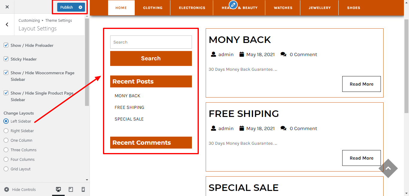 Go to Appearance >> Customize >> Themes Settings >> Layout Settings