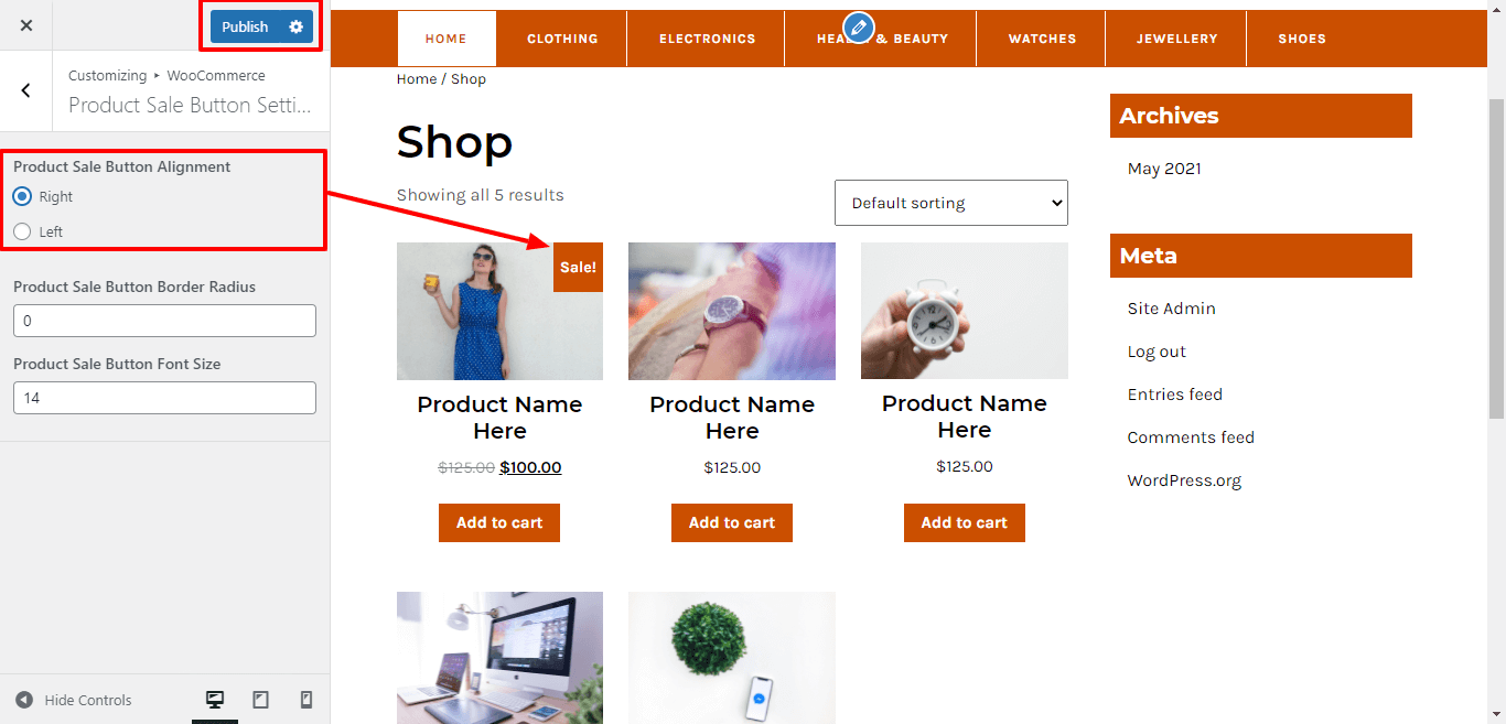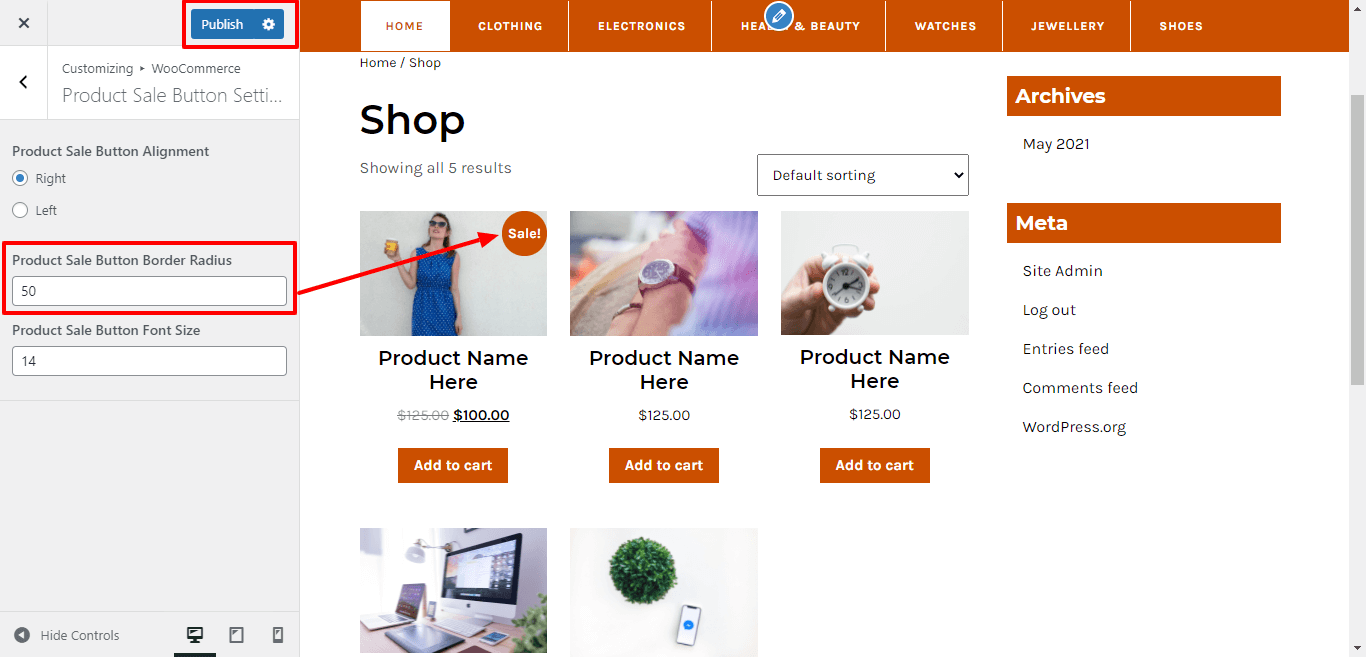 Here You have an option to add border radius for product sale button of the theme.