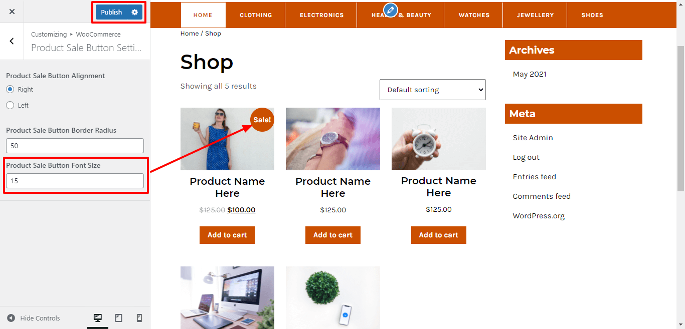 Here You have an option to add sale button font size of the theme.