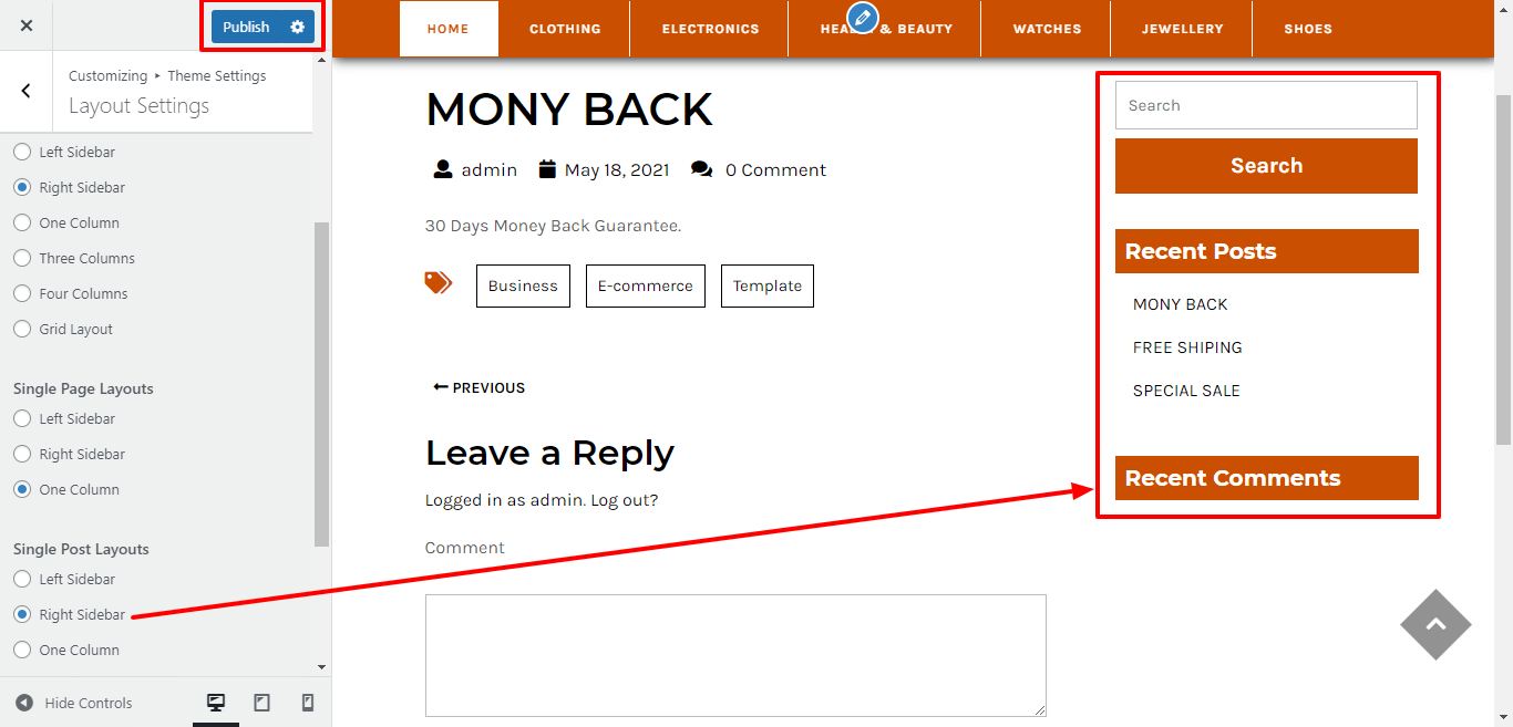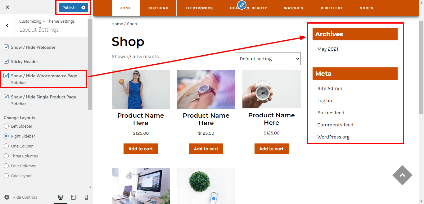 In Layout Settings, Here You can click the checkebox if you want to show / hide woocommerce page sidebar.