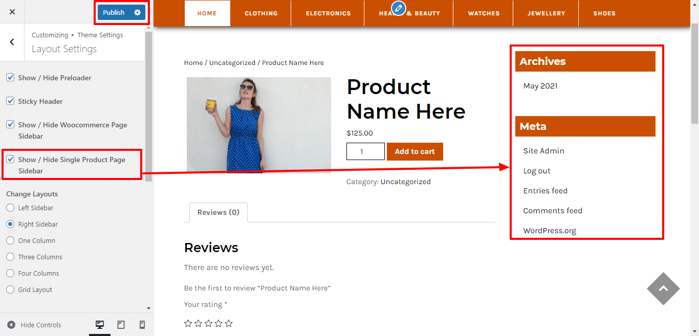 In Layout Settings, Here You can click the checkebox if you want to show / hide single product page sidebar.