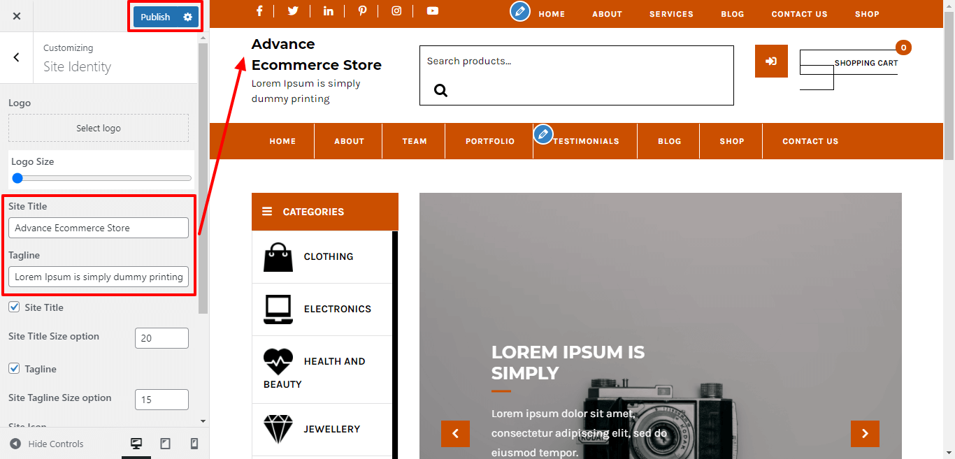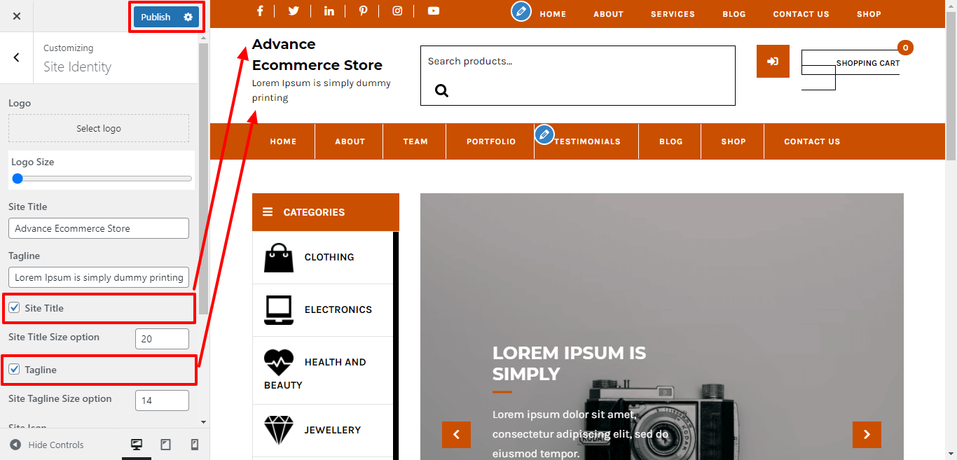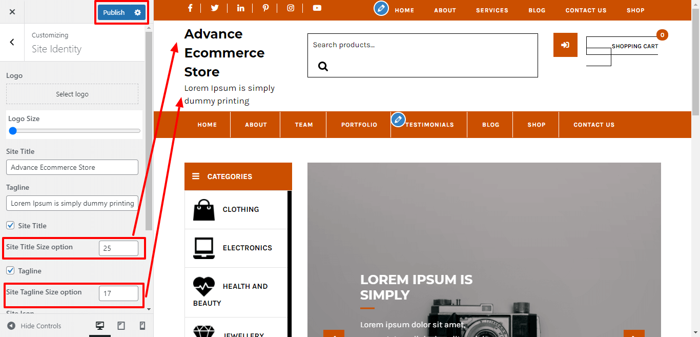 Here you can select the size for site title and tagline for the theme.