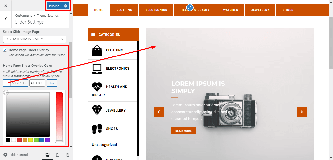 Here You can select show / hide slider image overlay and select the Background color, for Slider Image display transparent.