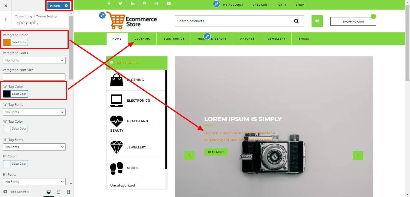 1. Color: Here you can change the colors of all Paragraph, 'a' tag, 'li' tag, H1, H2, H3, H4, H5 and H6 respectively.