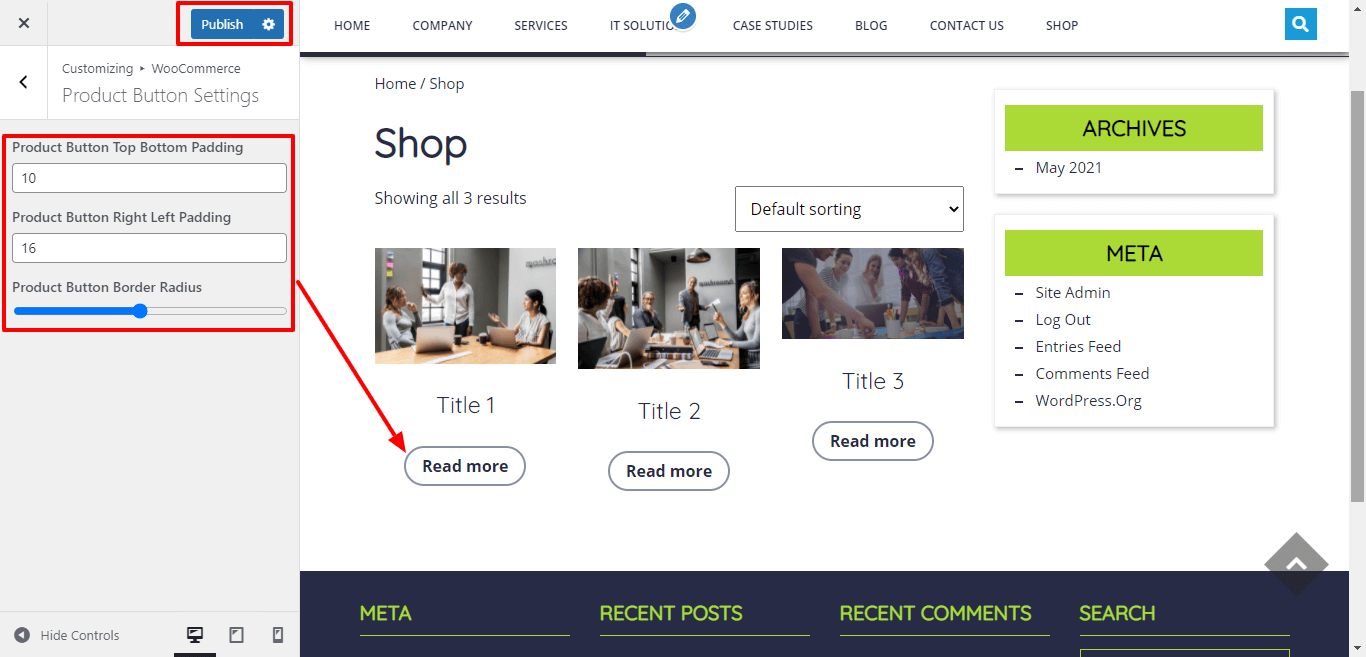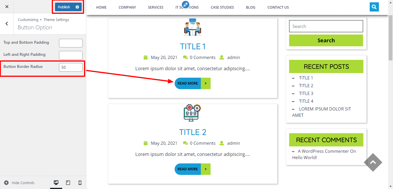 Go to Appearance >> Customize >> Theme Settings >> Button Options