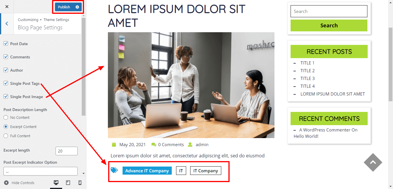 For show/hide single post tags and single post image, click on the checkbox for the theme.