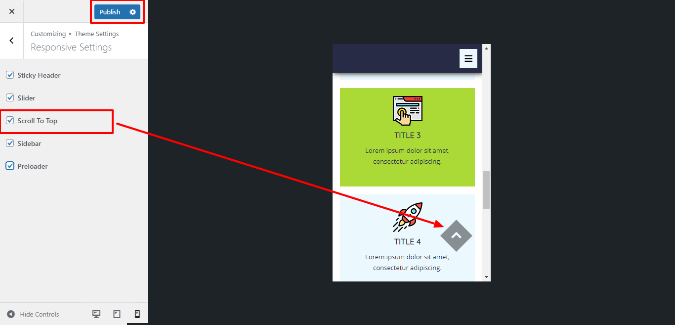 For show or hide Scroll Top Button, click twice on the checkbox and select the position for scroll top button.
