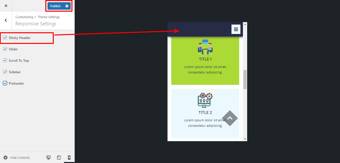 For Enable / Disable stick-header for mobile device or responsive media click on checkbox .