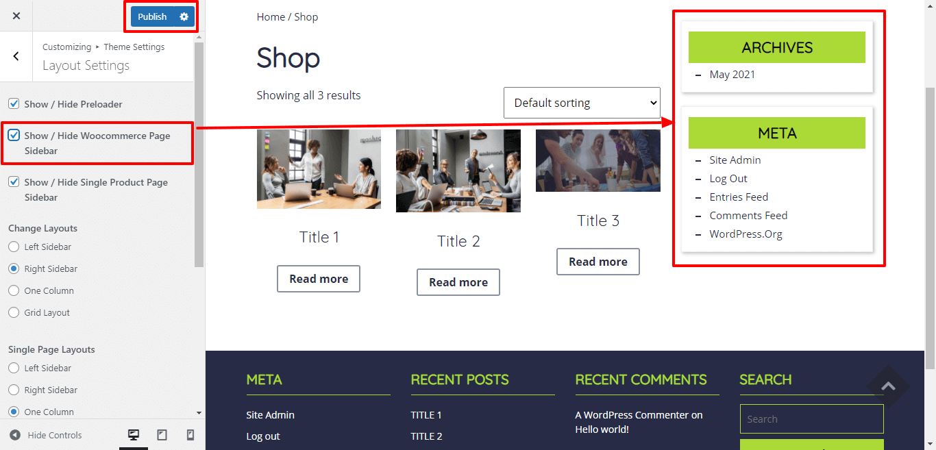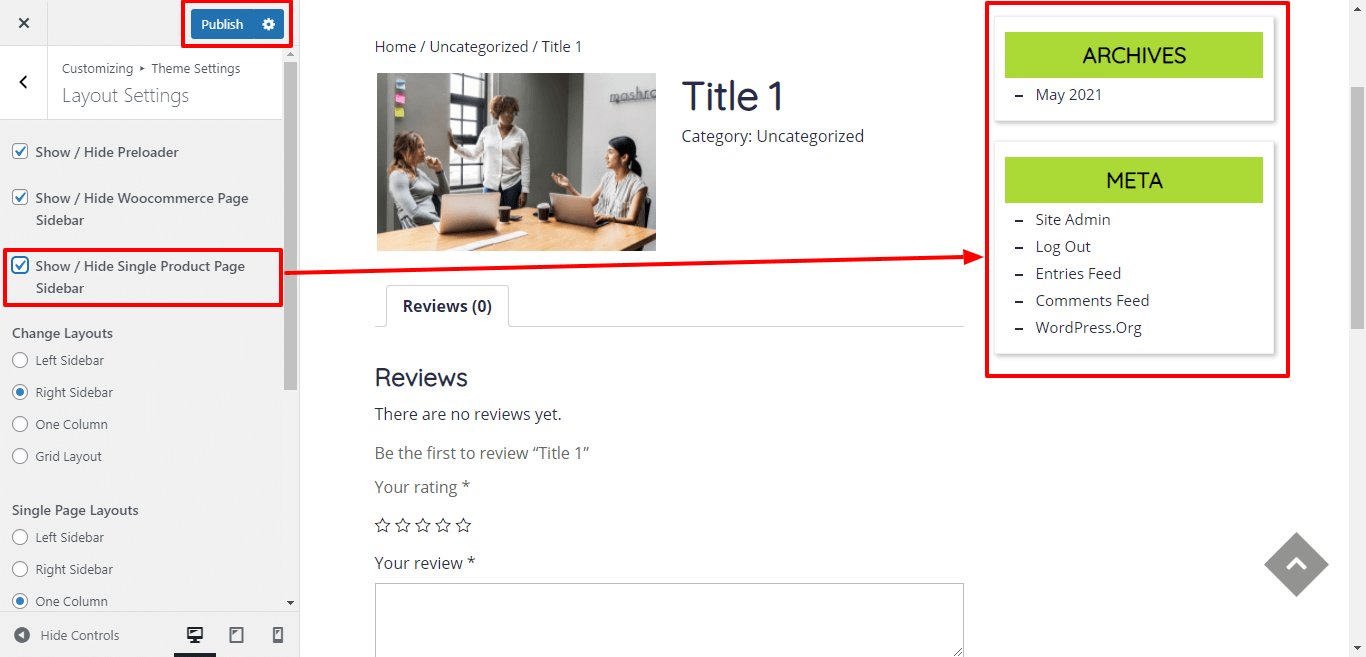 In Layout Settings, Here You can click the checkebox if you want to show / hide Woocommerce page sidebar.