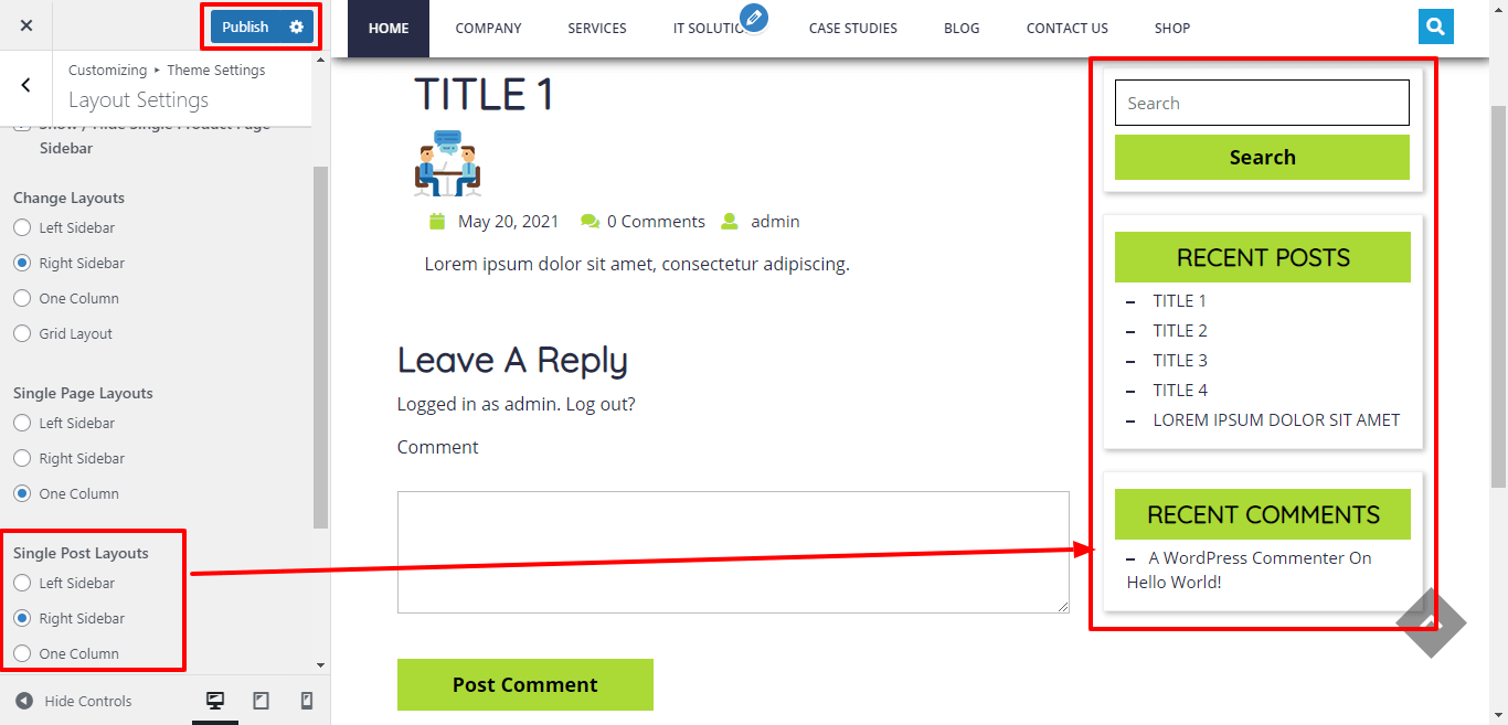 In Layout Settings, you can select the Single Post Layout Sidebar.
