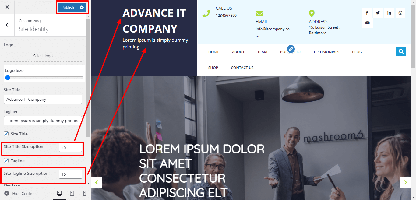 Here you can select the size for site title and tagline for the theme.