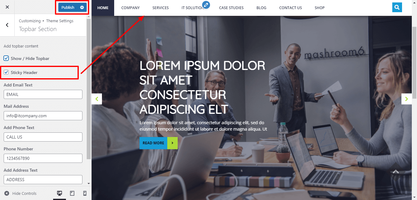For the sticky header of the theme click on checkbox for the theme.