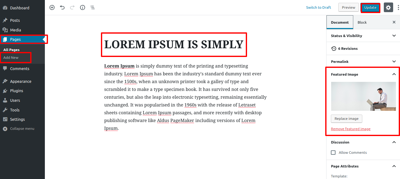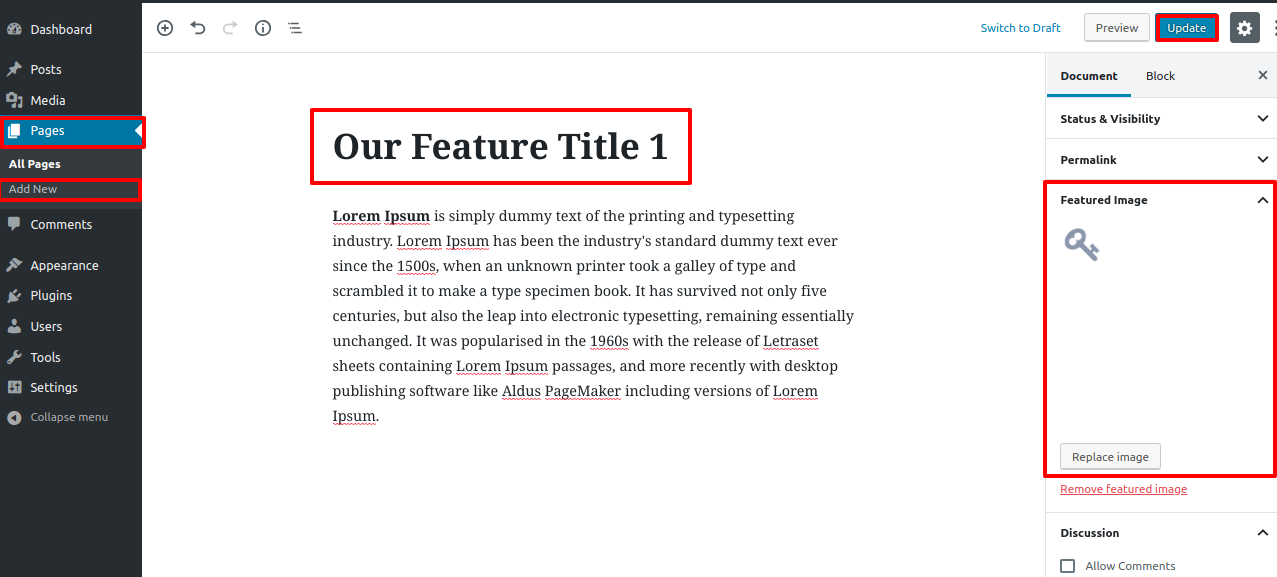 1. Create a new page and name it, set it's featured image, title, and the content. Repeat this process for other pages.