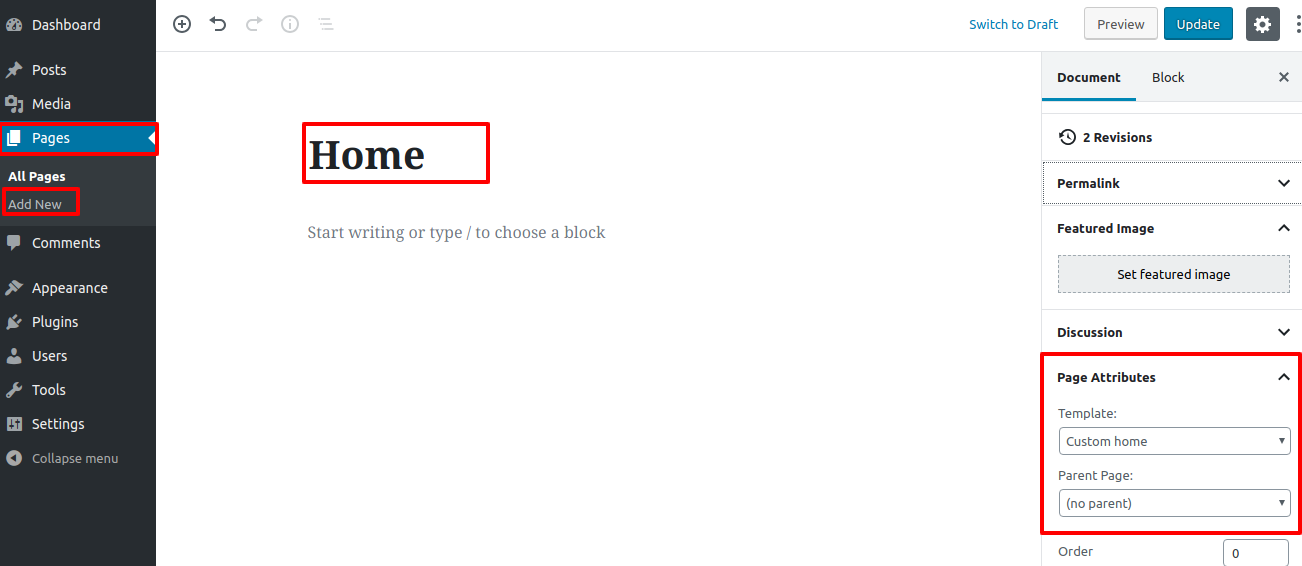 Label it "Home". Then select template "Custom Home" from template dropdown.