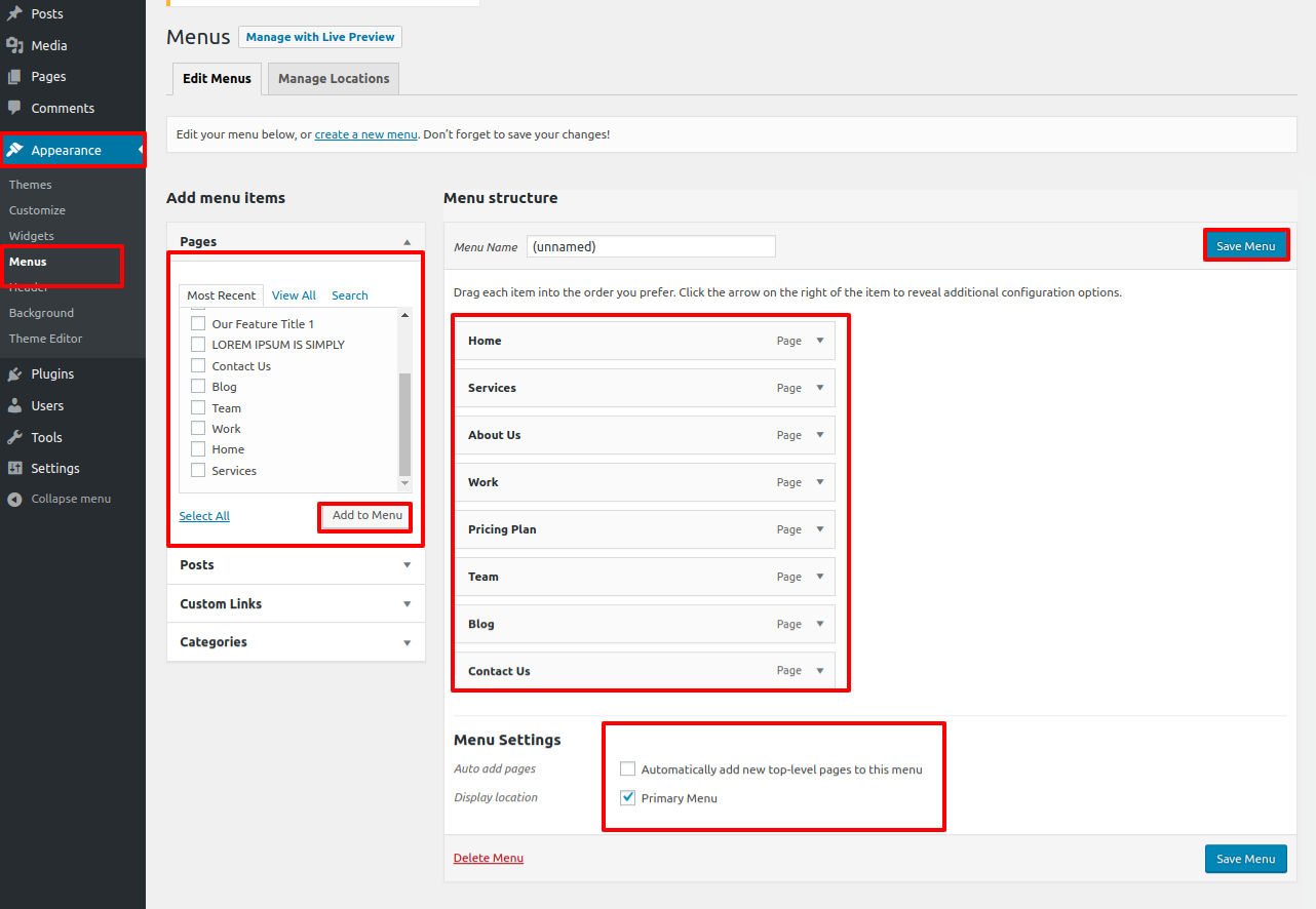 Once you have create menu. You need to add pages by selecting with checkboxes. After adding menu list you can arrange it by drag and drop.