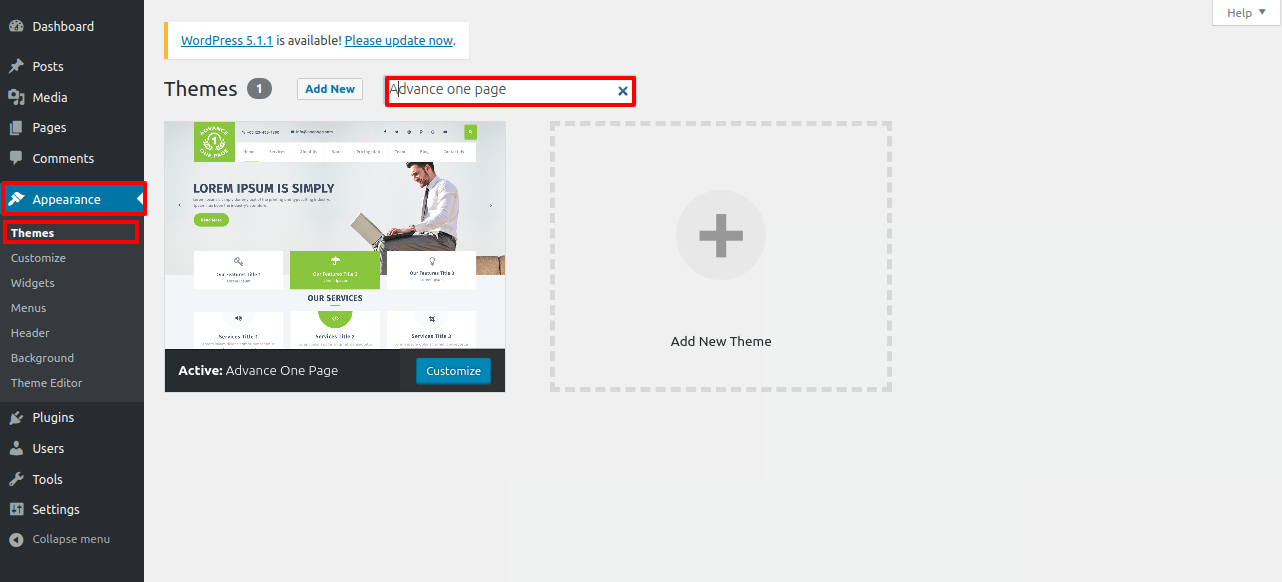 Based on your search, you will see a single theme or a list of themes that met your criteria. In our case, we searched for the theme Advance One Page.