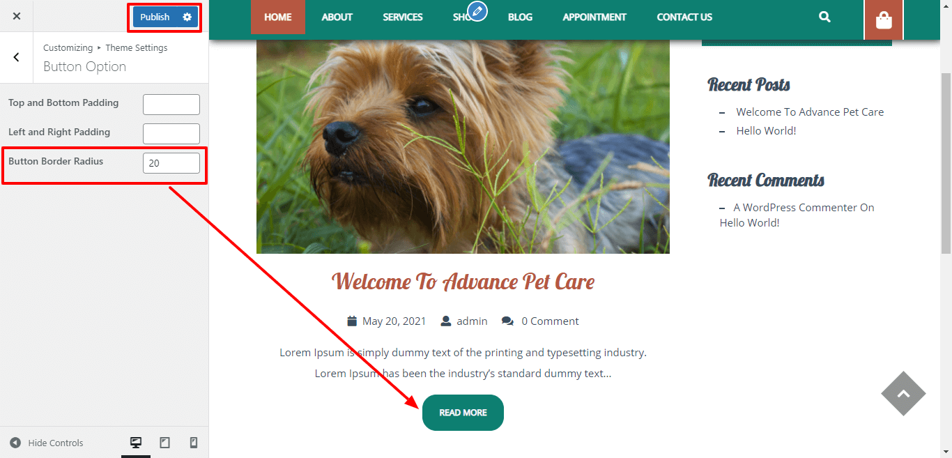 Go to Appearance >> Customize >> Theme Settings >> Button Options