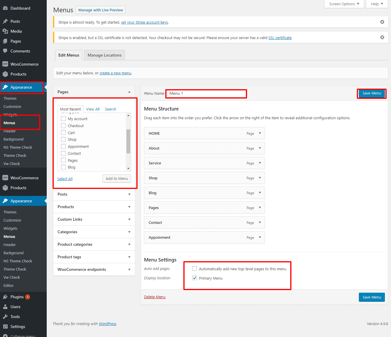 Once you have create menu. You need to add pages by selecting with checkboxes. After adding menu list you can arrange it by drag and drop.