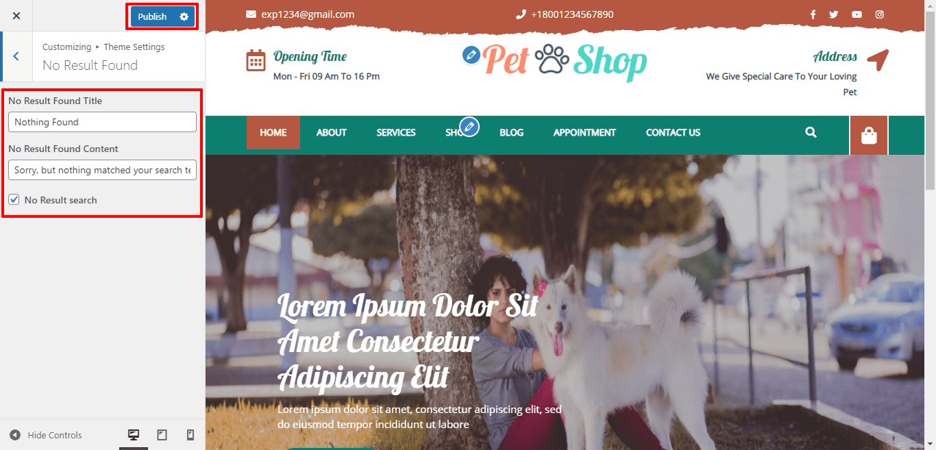Go to Appearance >> Customize >> Themes Settings >> No Result Found
