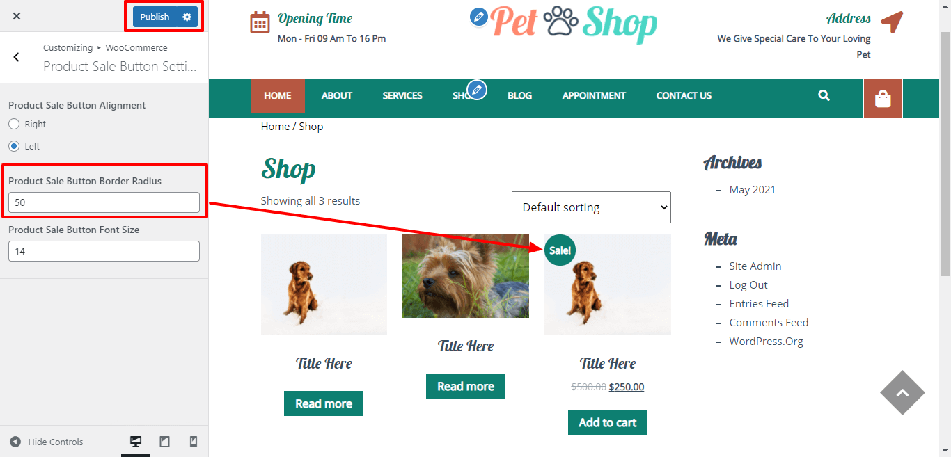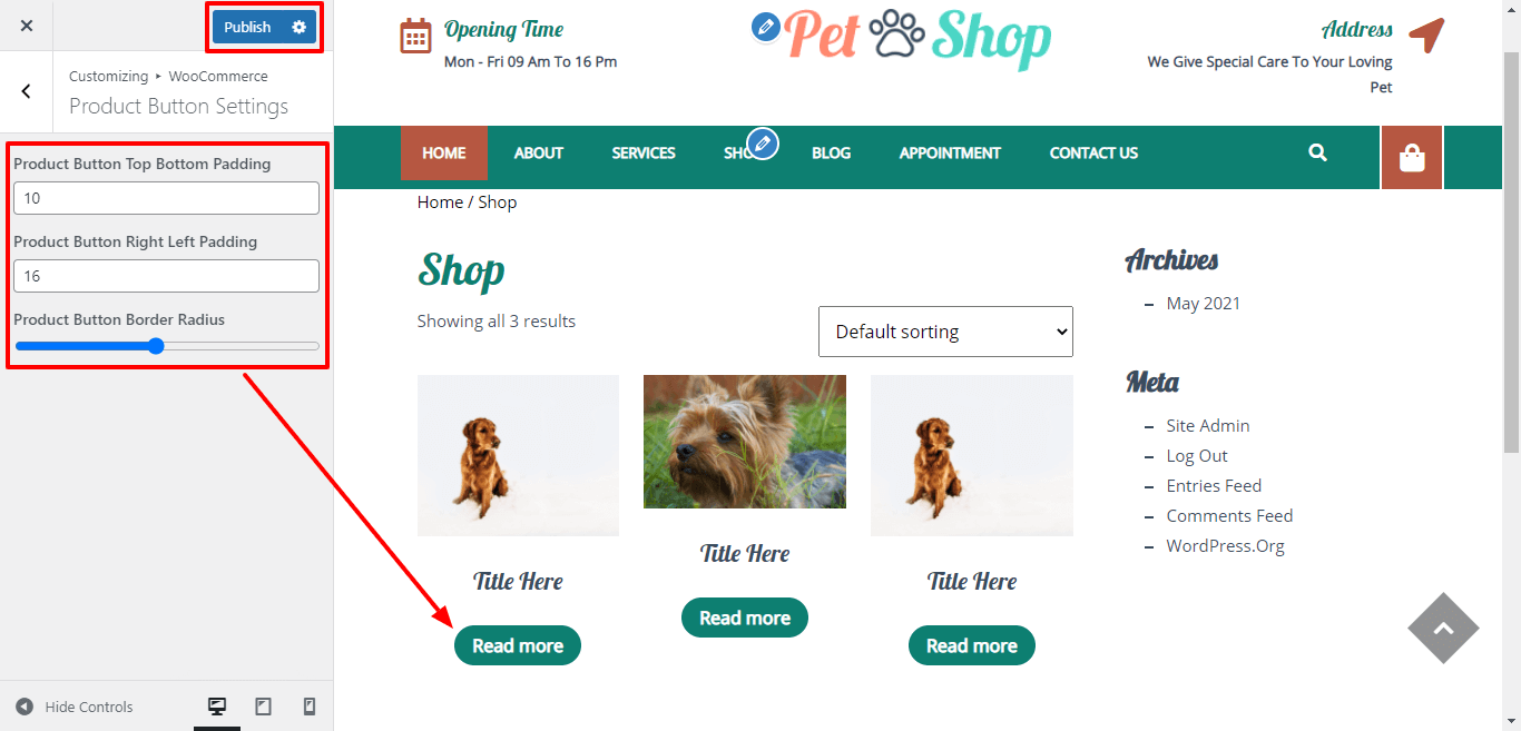 Here You have an option to add top-bottom, left-right padding product button and radius of product button for theme.