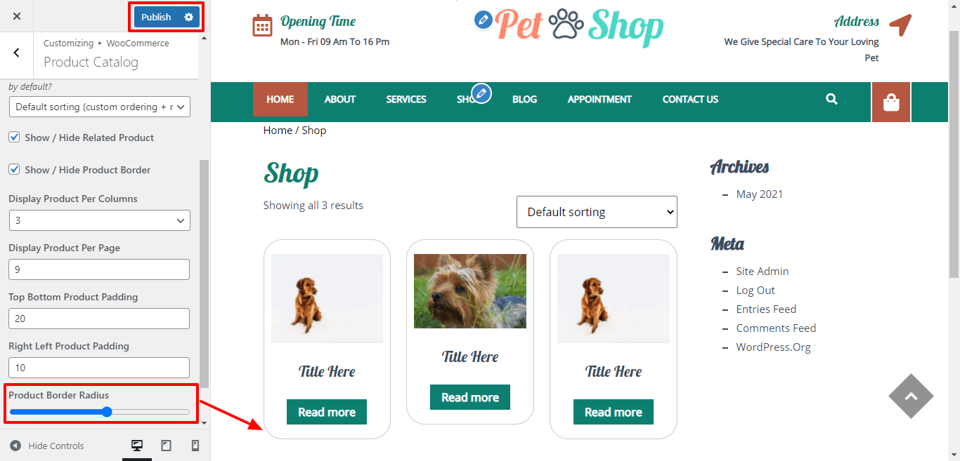 Go to Appearance >> Customize >> Woocommerce >> Product Catalog