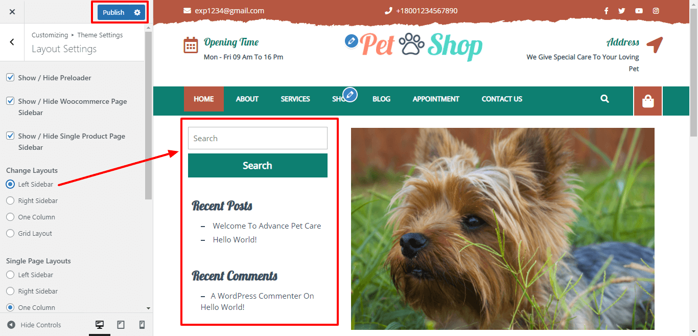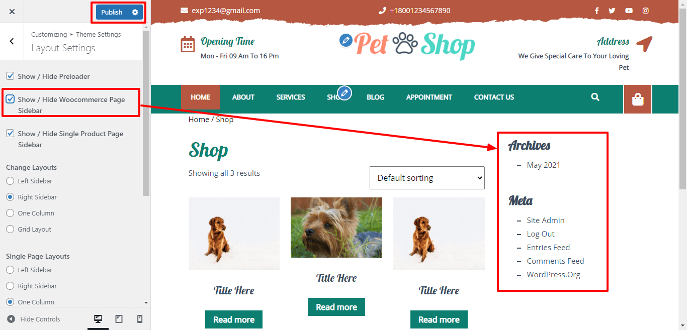In Layout Settings, Here You can click the checkebox if you want to show / hide woocommerce page sidebar.