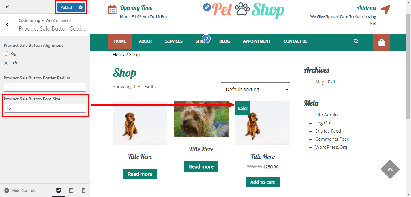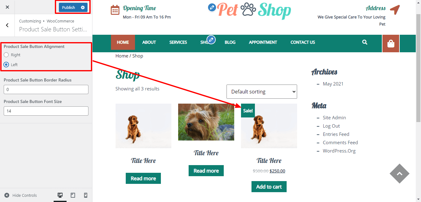 Go to Appearance >> Customize >> Woocommerce >> Product Sale Button Settings