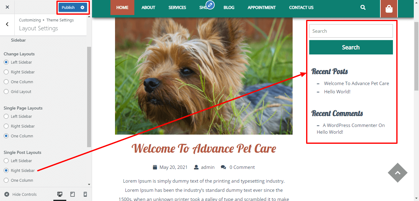 In Layout Settings, you can select the Blog Post Layout Sidebar.