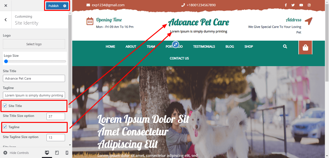 For show / hide site title and tagline for the theme, click on the checkbox for the theme.