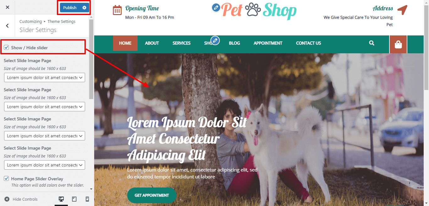 Go to Appearance >> Customize >> Themes Settings >> Slider Settings
