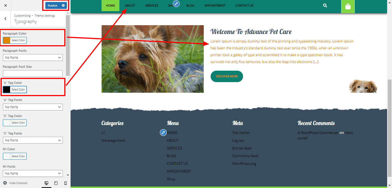 1. Color: Here you can change the colors of all Paragraph, 'a' tag, 'li' tag, H1, H2, H3, H4, H5 and H6 respectively.