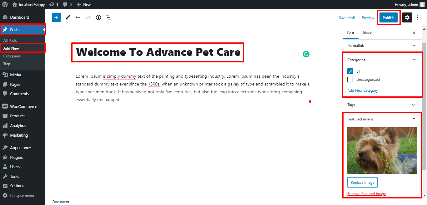 Here you can add new post and give title for the post , write some content and set featured image and public it.