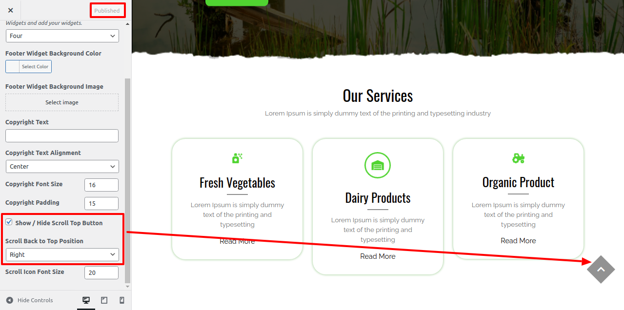For show or hide Scroll Top Button, click twice on the checkbox and select the position for scroll top button.
