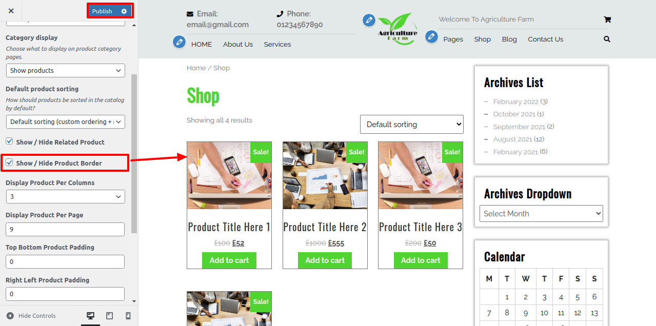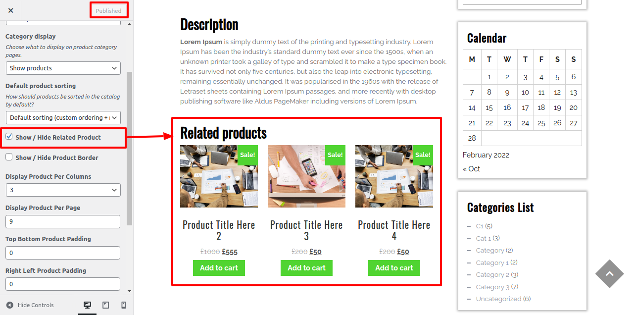 Here You have an option to Enable / Disable Feature Related product of shop page by click on checkbox.
