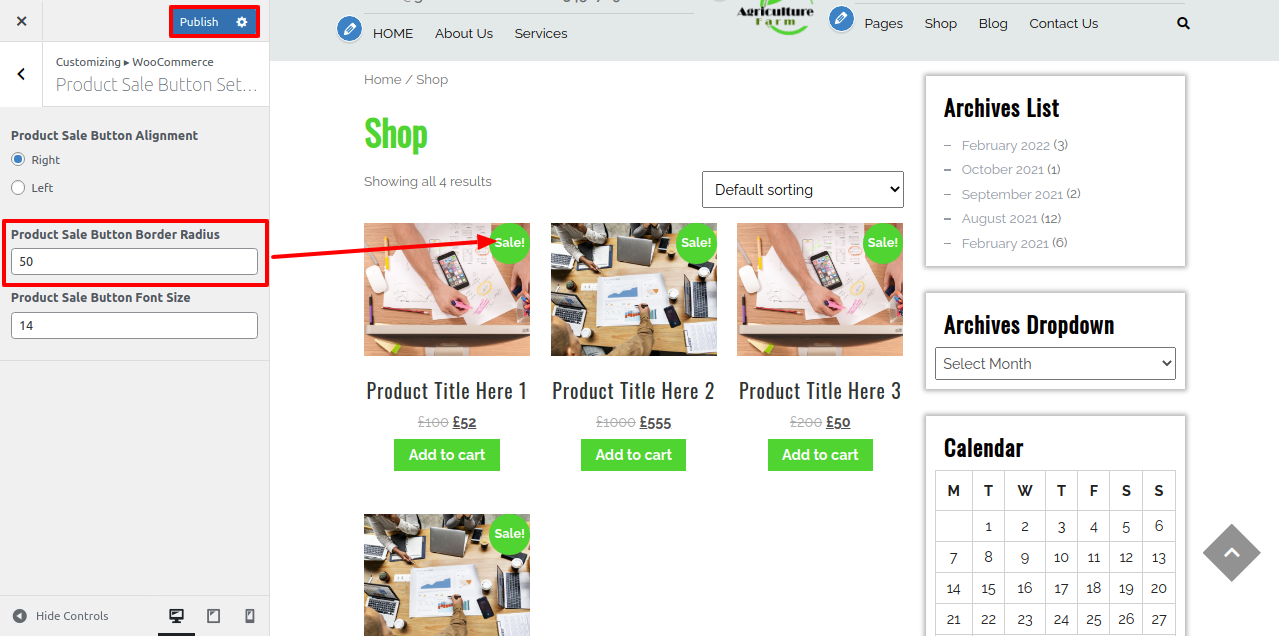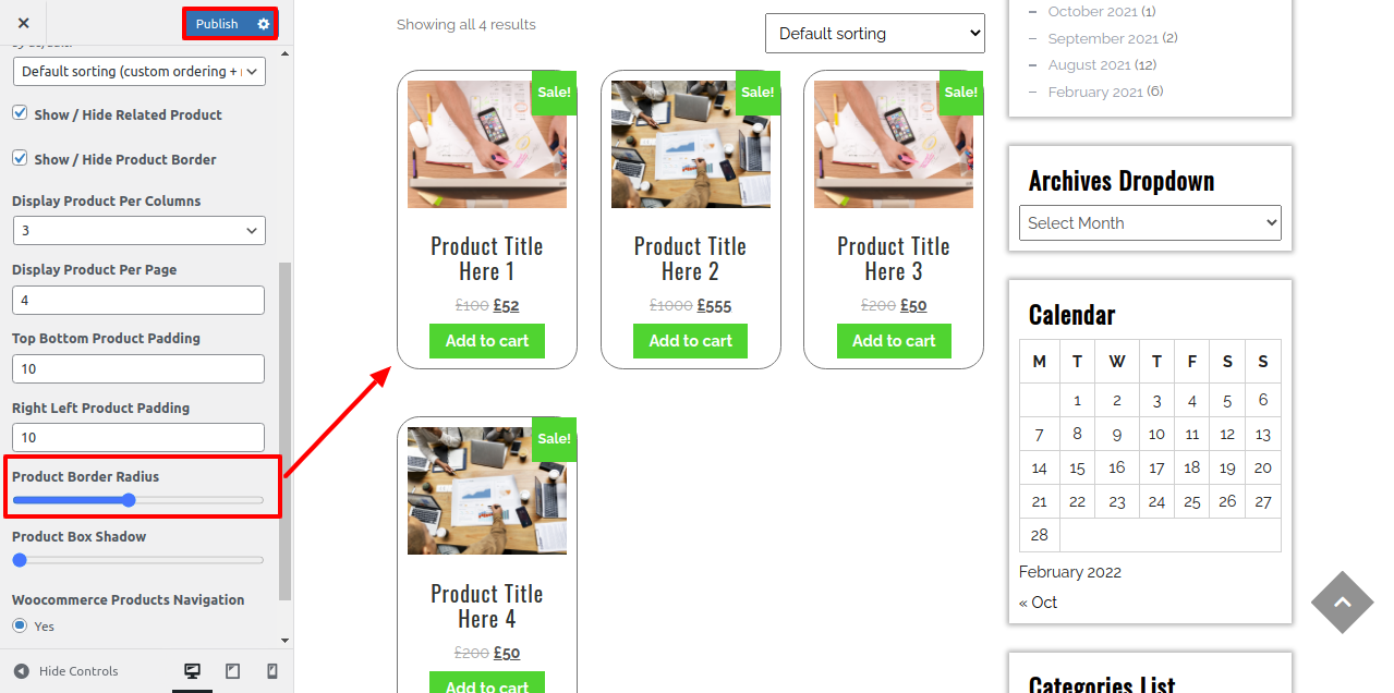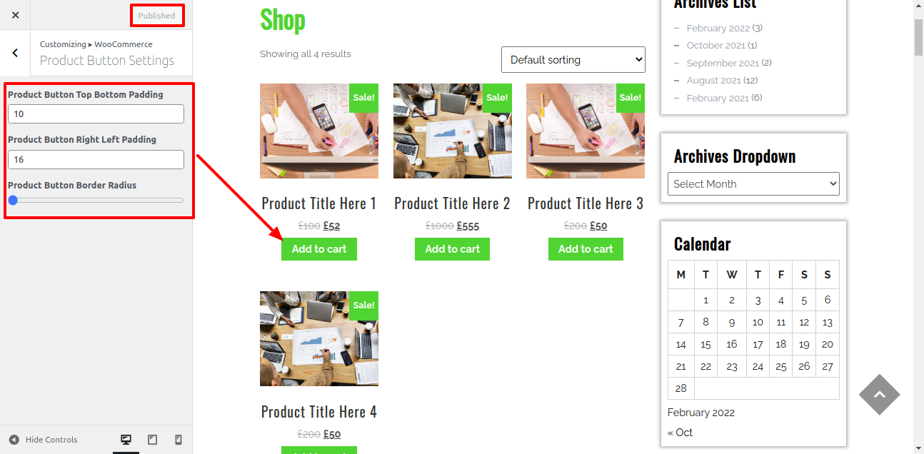 Here You have an option to add top-bottom, left-right padding product button and radius of product button for theme.