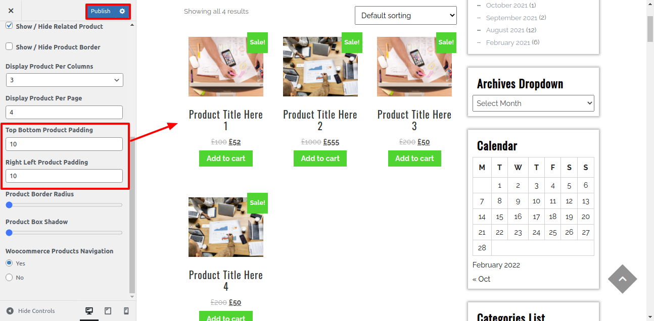 Here You have an option to top-bottom, left-right padding for product border and image.