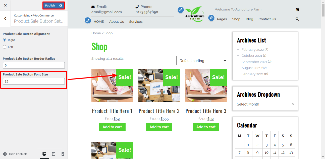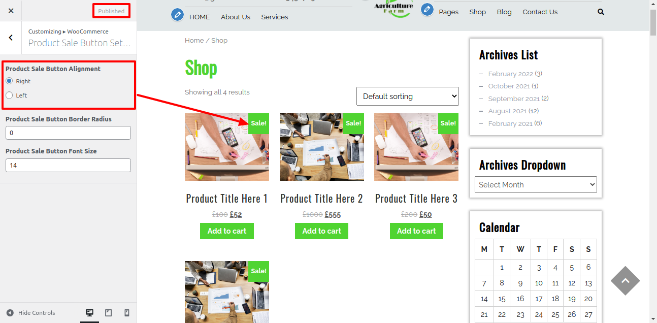 Go to Appearance >> Customize >> Woocommerce >> Product Sale Button Settings