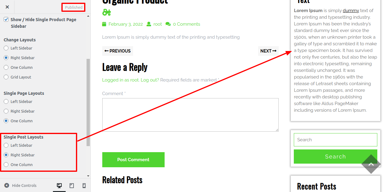 In Layout Settings, you can select the Blog Post Layout Sidebar.