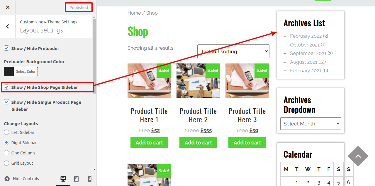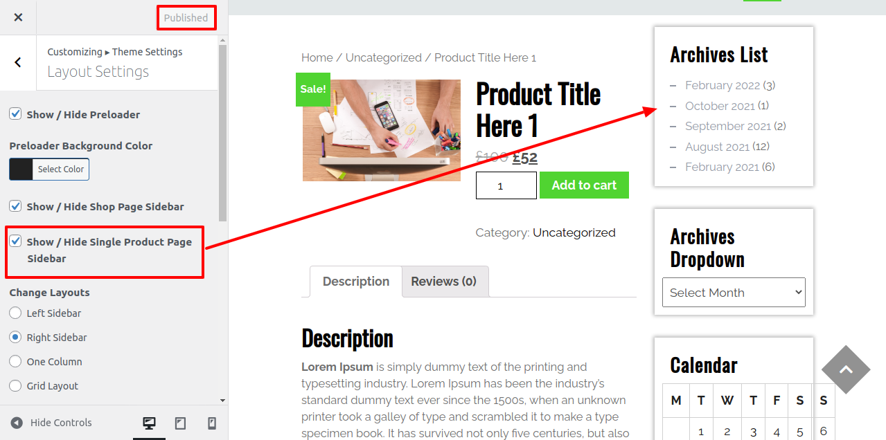 In Layout Settings, Here You can click the checkebox if you want to show / hide woocommerce page sidebar.