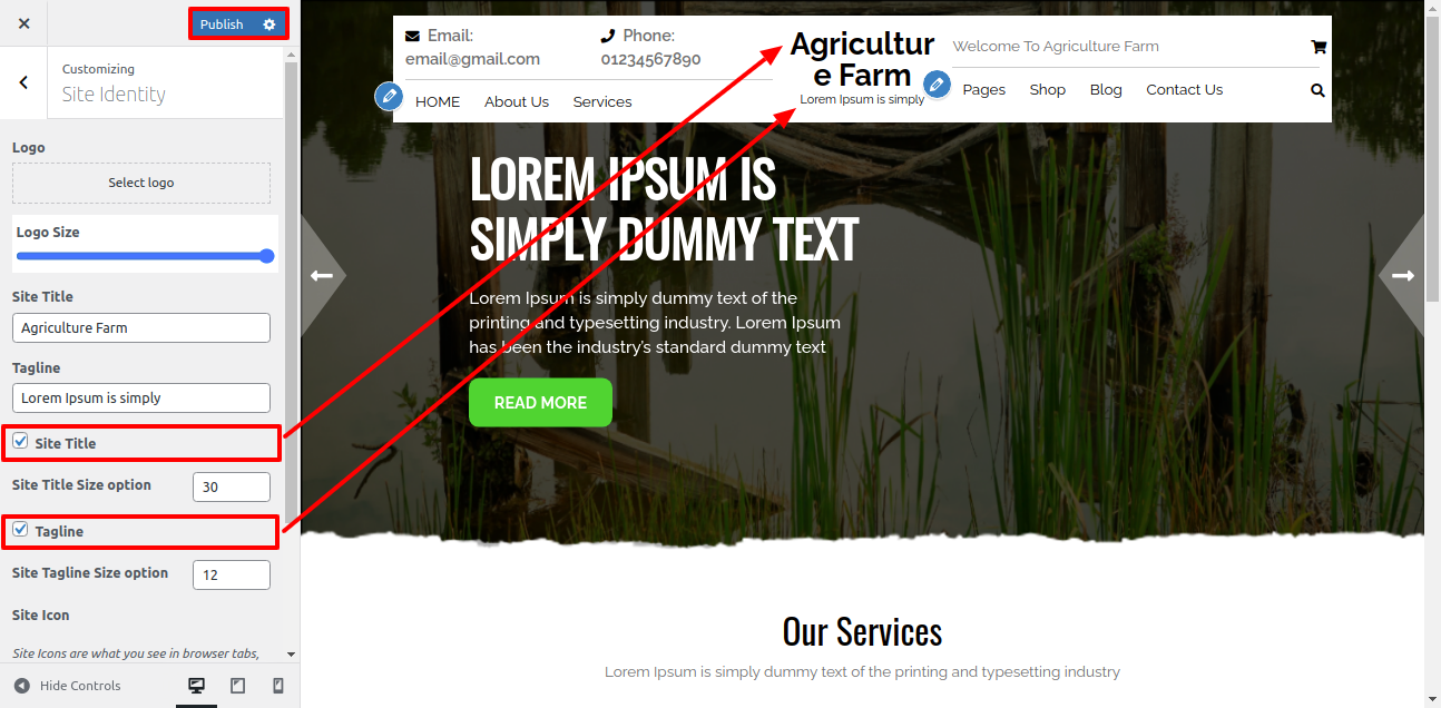 For show / hide site title and tagline for the theme, click on the checkbox for the theme.