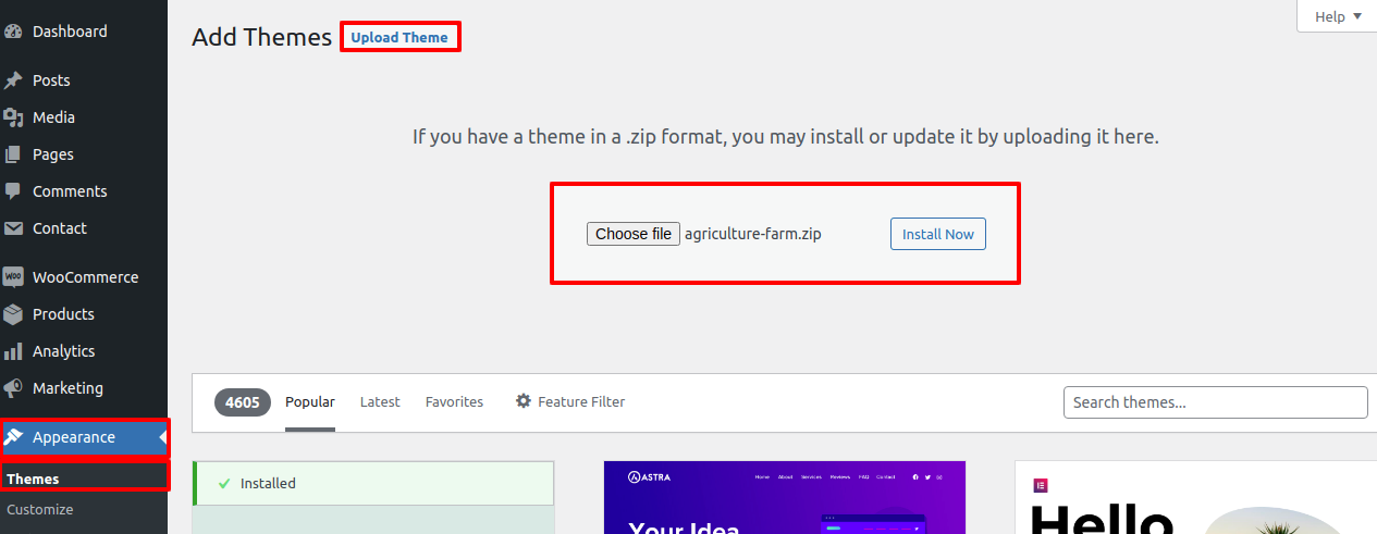 Remember you must unzip the folders before you upload a theme using FTP. Once you have uploaded the theme, you would need to go to your admin area and click on Appearance >> Themes.