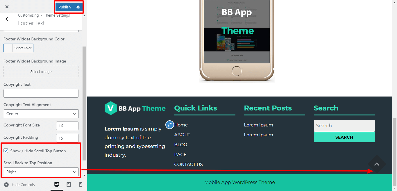 For show or hide Scroll Top Button, click twice on the checkbox and select the position for scroll top button.