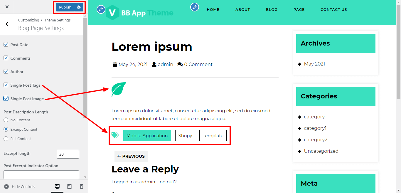 For show / hide single post tags and single post image, click on the checkbox for the theme.