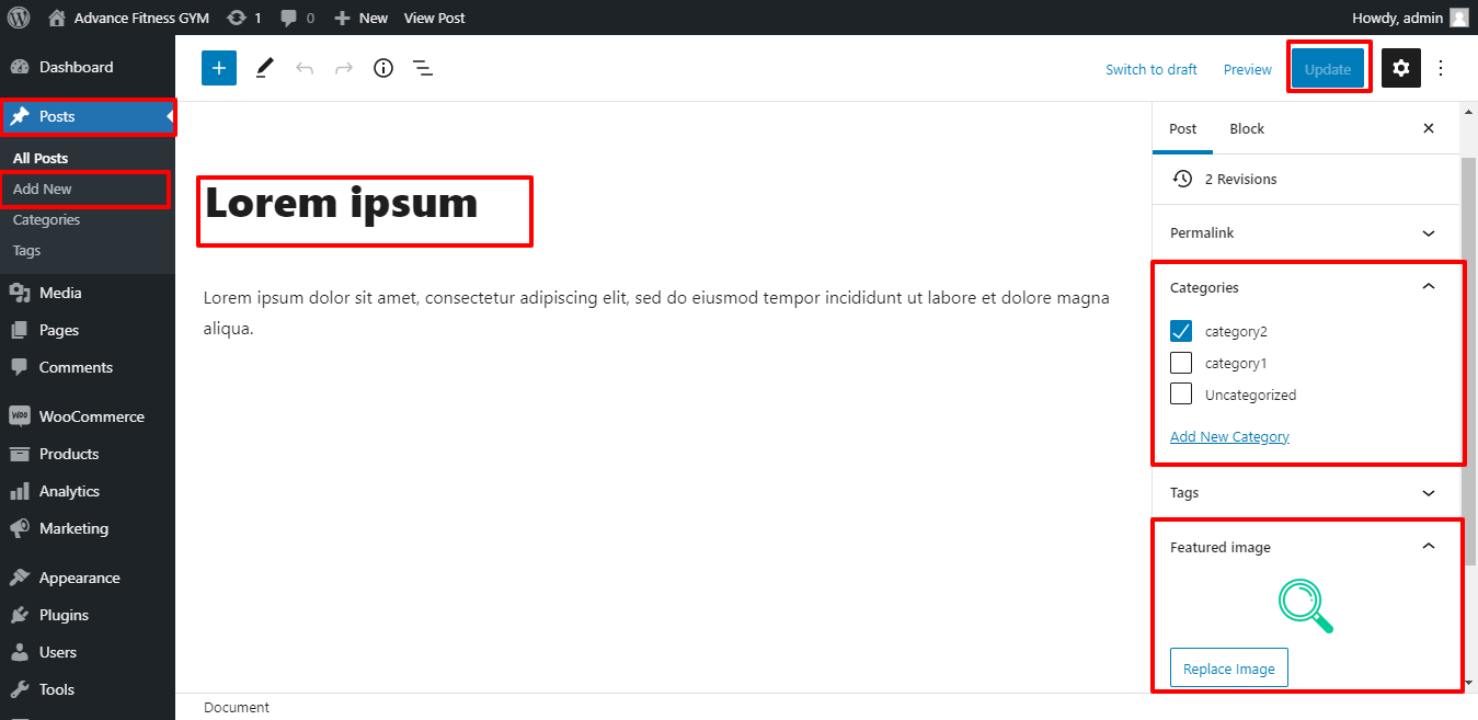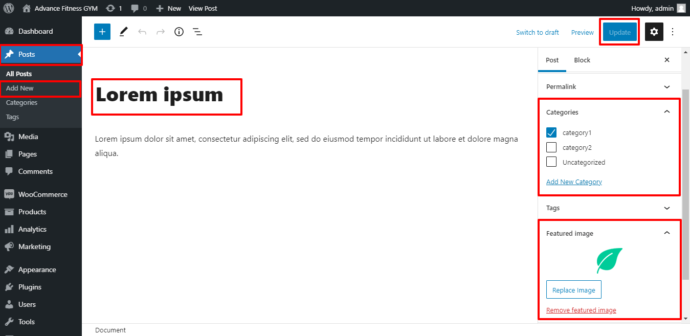 Here you can add new post give title the post, write some content, set category , set featured image and publish it..