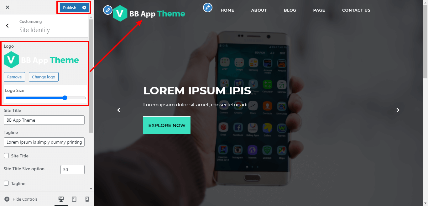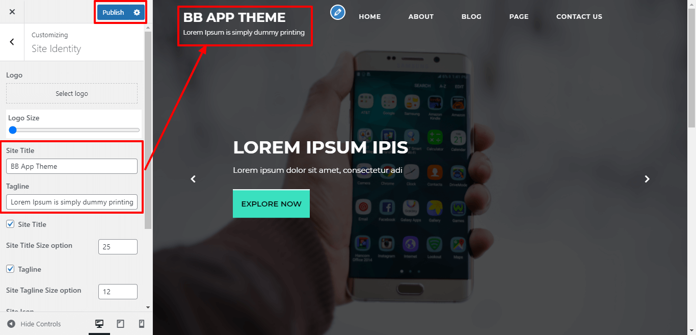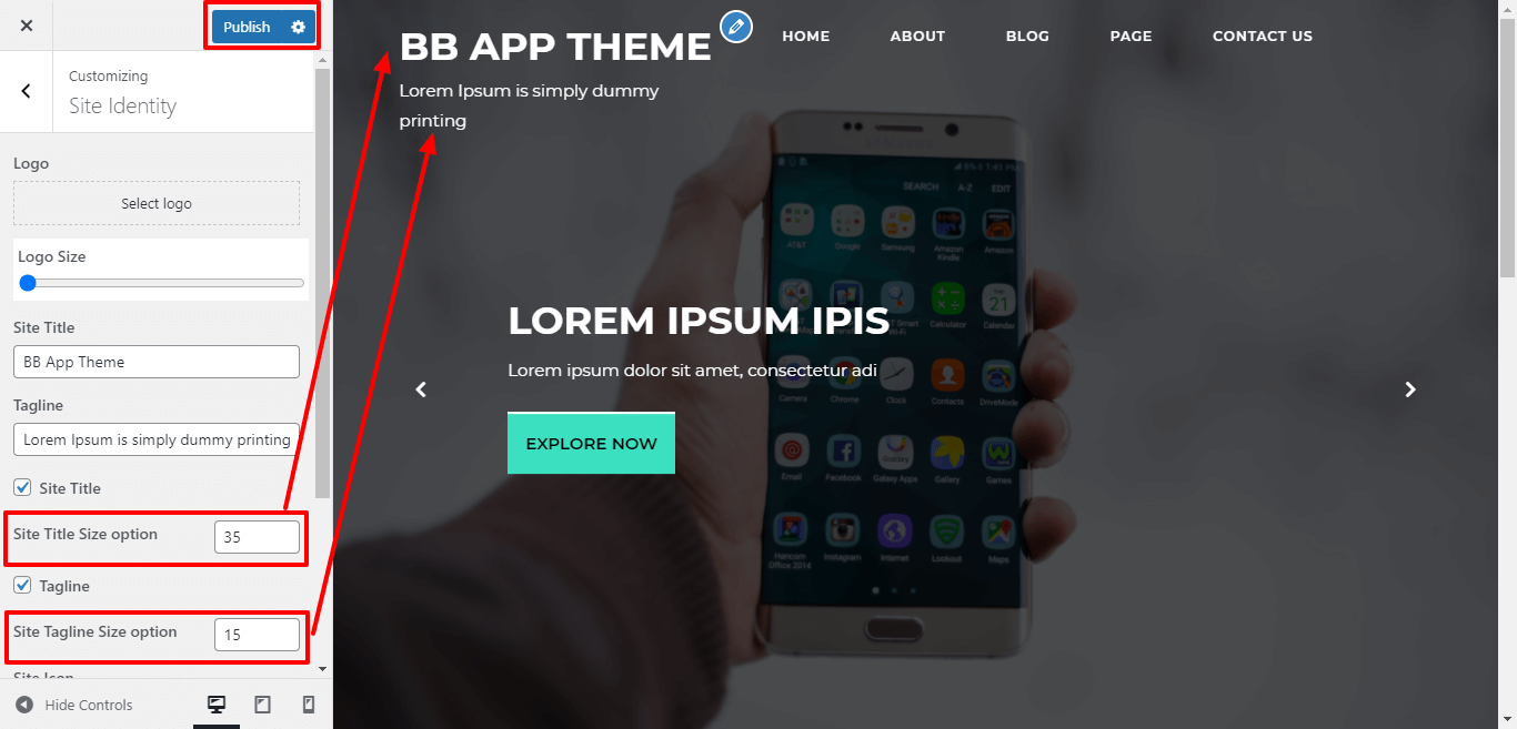 Here you can select the size for site title and tagline for the theme.