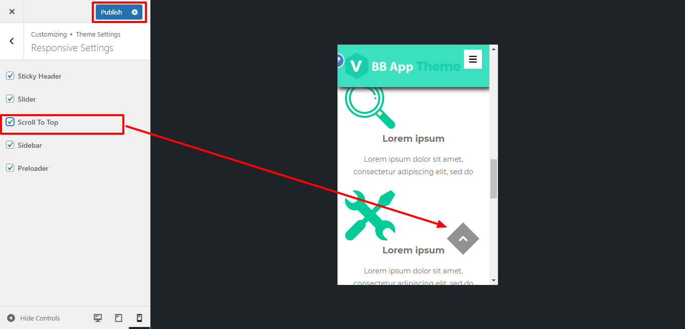 For Enable / Disable scroll to top for mobile device or responsive media click on checkbox .
