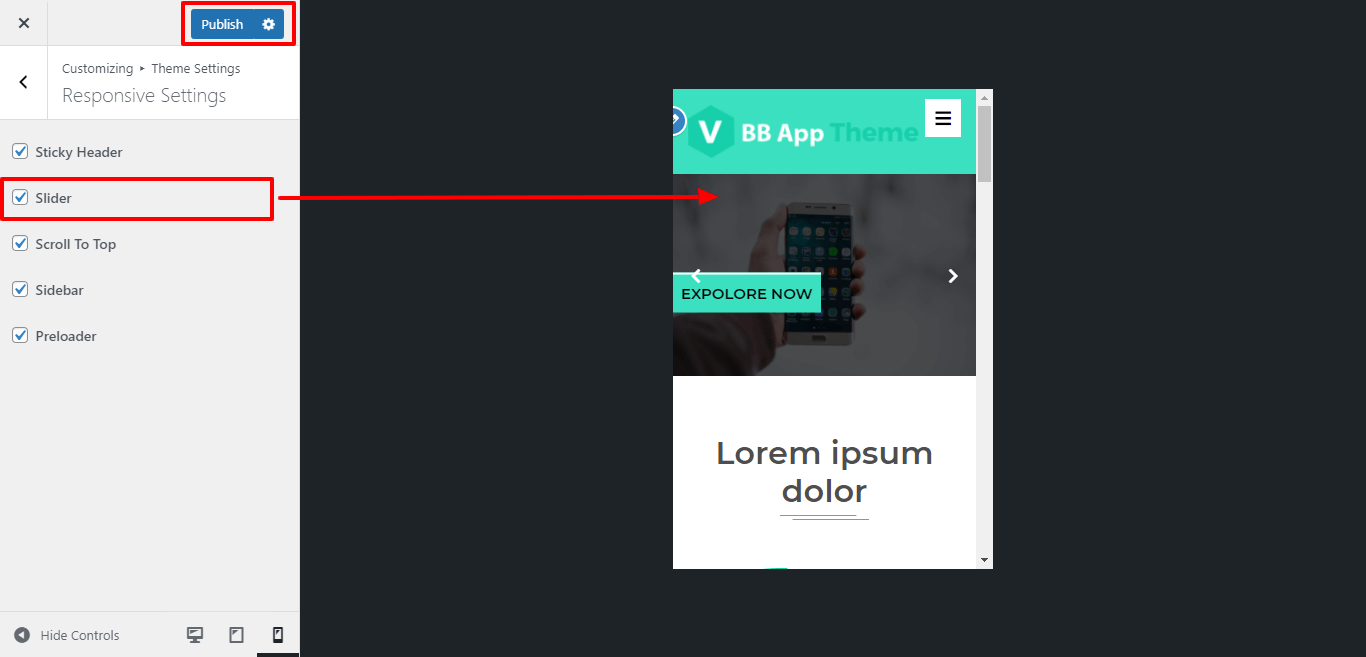 For Enable / Disable slider for mobile device or responsive media click on checkbox .