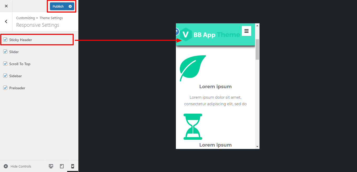 For Enable / Disable stick-header for mobile device or responsive media click on checkbox .