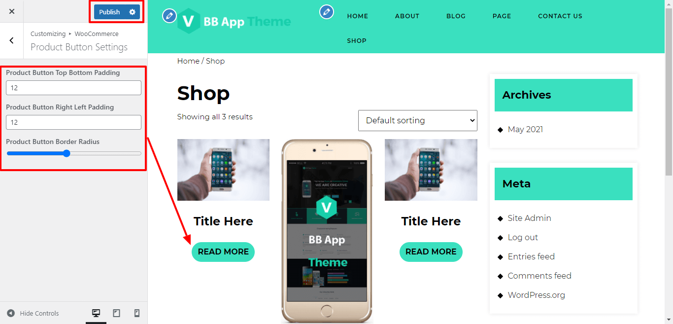 Here You have an option to add top-bottom, left-right padding product button and radius of product button for theme.