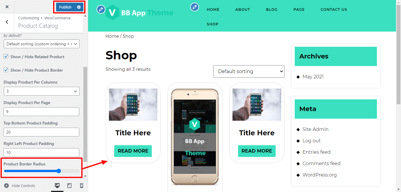 Here You have an option to give border radius to product.